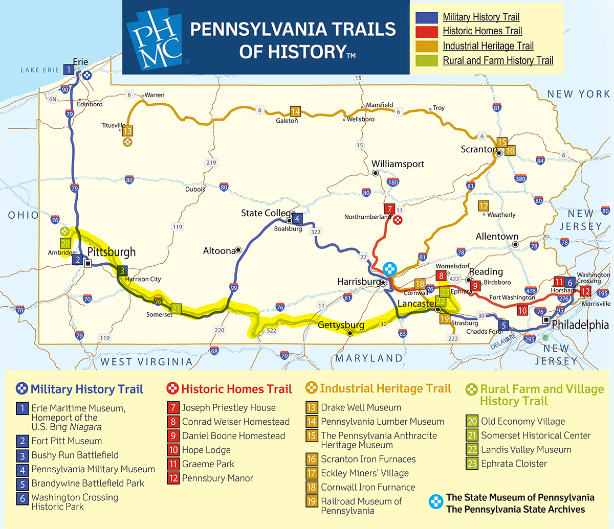 The Pennsylvania Trails of History directs you to every corner of the state. From Washington Crossing Historic Park on the Delaware River to Lancaster County’s Railroad Museum of Pennsylvania, and from Erie’s U.S. Brig Niagara to Old Economy Village along the Ohio River Trail in Ambridge, Pennsylvania.